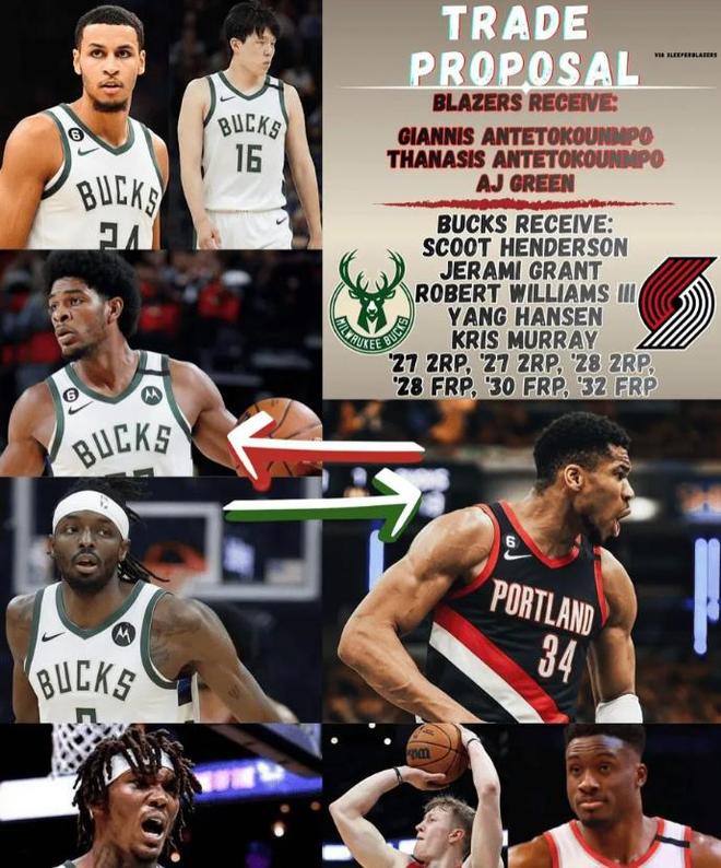 具体为:开拓者送出亨德森,格兰特,罗威,杨瀚森,默里和28年首轮,30年首轮,32年首轮,两个27年次轮和一个28年次轮,换来雄鹿的扬尼斯-阿德托昆博和萨纳西斯外加AJ格林!